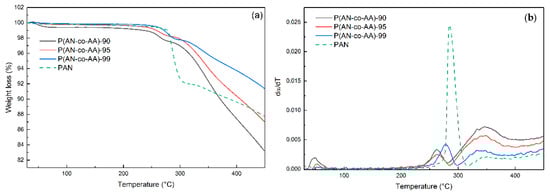 An analysis of the temperature dependence of the derivative of the conversion degree in the range of 200–320 °C (Figure 5b) revealed that the addition of AA resulted in a decrease in the temperatures of the onset of cyclization. The maximum mass loss rate for P(AN-co-AA)-99 was observed at a temperature of 277 °C, which is 6 °C lower than for PAN. A further increase in the AA content to 10% leads to a decrease in temperature to 262 °C, which is determined by the action of the ionic cyclization mechanism (low temperature). At temperatures of 320–450 °C, the intensification of the mass loss process is observed for the copolymers, which is presumably associated with the release of CO and CO2 from the AA units.