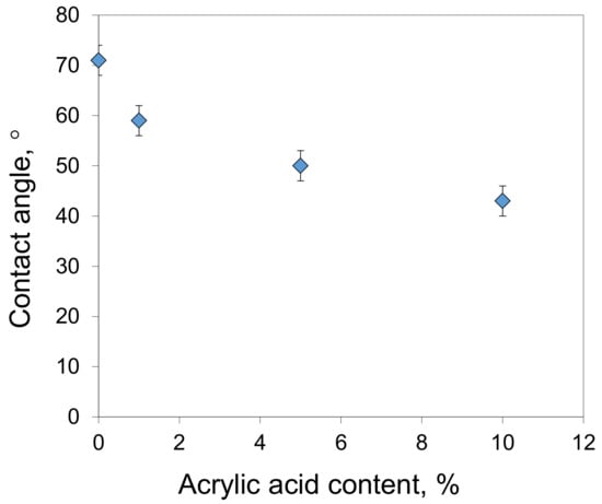 Acrylic acid chains are hydrophilic and their incorporation into the polymer increases the hydrophilicity of the obtained membranes. The hydrophilization effect was evaluated by measuring the water contact angles of the synthesized membranes (Figure 6). The addition of 1% of AA units decreased the water contact angle by 12° from 71 ± 3° to 59 ± 3°. For copolymers consisting of 10% AA units, the water contact angle was 43 ± 3°, which is 28° lower than that of the PAN membranes. This increase in hydrophilicity is important for the antifouling properties of the obtained membranes, as it helps to prevent the deposition of rejected components on the membrane surface.