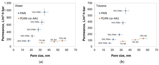 Permeance of water (a) and toluene (b) through membranes from PAN and P(AN-co-AA).