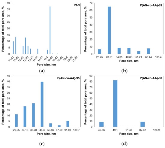 Examples of raw data of obtained pore size distributions for 20% PAN (a), P(AN-co-AA)-99 (b), P(AN-co-AA)-95 (c), and P(AN-co-AA)-90 (d).