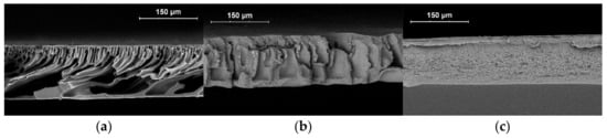 SEM images of the membrane cross-section with respect to the casting solution composition: (a) PAN; (b) P(AN-co-AA)-99; (c) P(AN-co-AA)-90.