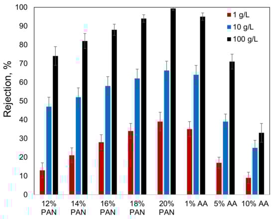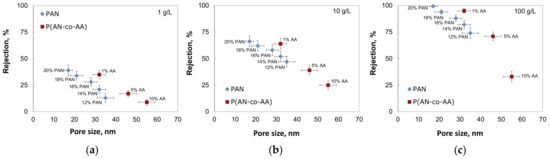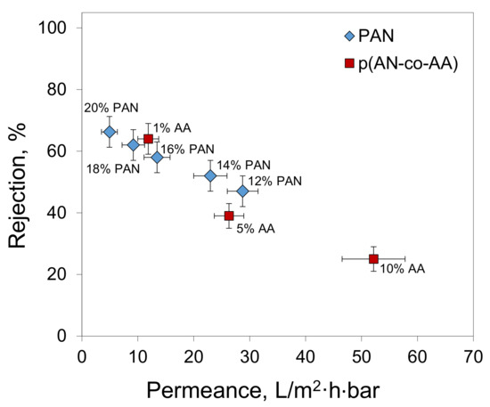 The decrease in the membrane rejection with an increase in the AA content can be explained by the increase in the membrane pore size. The comparison of the membranes’ rejection with their pore sizes revealed an interesting effect that the P(AN-co-AA)-99 membranes demonstrated higher rejection than PAN membranes with a comparable pore size (Figure 11). The mechanism behind this increase in membrane rejection requires further investigation and will be conducted in our future work.