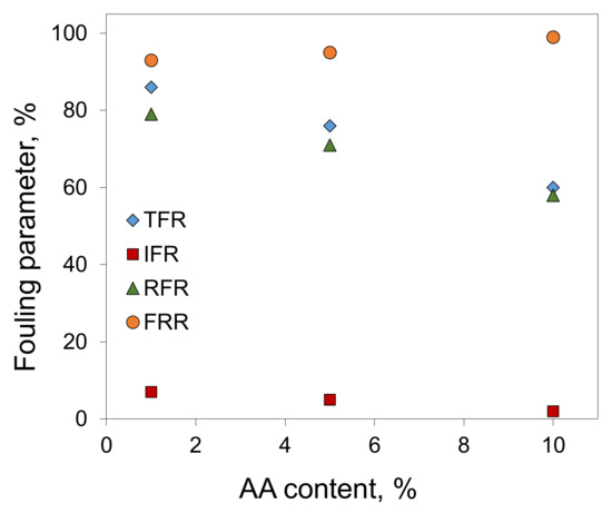 In the case of filtration of oil/toluene solutions, the calculation of the fouling parameters for the P(AN-co-AA) copolymers membranes showed that an increase in the AA content leads to a decrease in both the total fouling (TFR) and irreversible fouling (IFR) (Figure 12). This confirms that the addition of hydrophobic elements into the polymer chain improves the fouling resistance of the obtained membranes. When the AA content increased from 1% to 10%, the IFR decreased from 7% to 2%, indicating that permeance losses per time unit were more than three times lower.