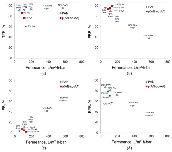 At the same time, the total fouling of all the membranes was found to be high (Figure 13a). In the case of the PAN membranes, the oil/toluene solution permeance was ten times lower than the toluene permeance. The addition of AA content decreases the TFR from 91–95% for PAN to 60% for P(AN-co-AA)-90. The inclusion of AA content also decreases the irreversible fouling, despite the tendency that an increase in the membrane permeance results in an increase in the irreversible fouling, as observed for the PAN membranes (Figure 13c). The addition of AA prevents irreversible fouling despite an increase in the membrane permeance.