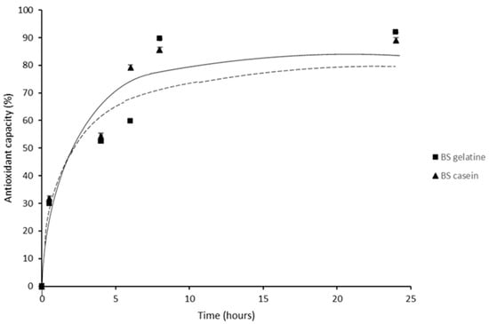 Figure 3 shows the antioxidant capacity of the birch sap gelatine and casein films. As can be seen from the graph, in both types of films, gelatine and casein, the use of birch sap as a biopolymer solvent gives them an important antioxidant capacity as compared to those made with distilled water. Moreover, the antioxidant activity increases steadily until 8 h, when it reaches the maximum, almost 90% of antioxidant capacity in both cases, which suggests that at that time most of the antioxidant compounds retained in the gelatine and casein matrix had been released. This antioxidant capacity may be due to the presence of different types of phenolic compounds and organic acids contained in the birch sap; phenolic acids are molecules with greater antioxidant capacity due to their radical scavenging activity via hydrogen atom donation, electron donation or singlet oxygen quenching [].