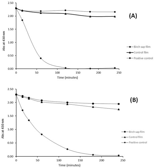 Figure 4 shows the change in absorbance at 430 nm of free curcumin solution (positive control) and of the curcumin solution packed in the control gelatine and casein films and in the birch sap gelatine and casein films. It can be seen that curcumin was completely degraded after 3 h of exposure to UV light, while the films offer curcumin an important degree of protection against degradation, the maximum degradation of the component being 17.46% in the case of the control gelatine film. It can also be observed that, although gelatine and casein control films offer curcumin important defense against degradation, the curcumin concentration shows a constant decrease with time, while birch sap films afford sufficient protection for the curcumin concentration to reach a plateau and remain almost constant over time. These phenomena may be due to the release of the antioxidants from the film matrix, offering an extra photoprotective effect of approximately 10%, by favouring their own photooxidation instead of that of curcumin. These results are in concordance with those observed by Castillo et al. [] when encapsulating curcumin in γ-cyclodextrin. It was found that the complexation of curcumin to γ-cyclodextrin prevented the demethoxylation and photochemical degradation undergone by free curcumin.