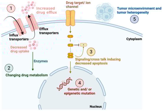 Numerous mechanisms can lead to drug resistance in cancer (Figure 1). For instance, cancer cells can develop chemoresistance by elevating the efflux of drugs from within the cells via ATP-binding cassette (ABC) transporters and/or reducing the absorption of the drugs via influx transporters, such as solute carriers [5,6]. Significant evidence strongly suggest that cancer cell resistance to a wide range of anticancer drugs, including anthracyclines, is mediated by the overexpression of ABCC1, which is the first ABC transporter identified in humans [7]. Additionally, the acquisition of chemoresistance could be achieved via changes in drug metabolism, such as reducing the activation of drugs and increasing drug inactivation with the help of enzymes such as glutathione S-transferase and cytochrome P450 [8,9]. Indeed, these enzymes regulate the levels of the agents in both the intracellular and extracellular compartments [10]. In addition, the effectiveness of chemotherapeutic agents can be affected by mutations and alterations in the expression levels of the molecules they target [10]. For example, cancer cells with mutant topoisomerase II may alter the cell’s response to doxorubicin [11]. Additionally, epigenetic changes and the regulation of miRNA are fundamental mechanisms that contribute significantly to the development of drug resistance in cancer treatment. It has been shown that the demethylation of the multi-drug resistance (MDR1) gene in cancer cells leads to chemoresistance caused by the reduced accumulation of anti-tumor agents within the cancer cells [10]. Likewise, the demethylation of the hMLH1 promoter gene, a key gene involved in DNA mismatch repair, via decitabine treatment coupled with the restoration of the mismatch repair system, enhances the sensitivity of colorectal cancer cells to fluorouracil-5 [12]. Recent studies focusing on miRNA profiling have also provided evidence supporting the significant role of these small molecules in the development of chemosensitivity or chemoresistance [10]. Moreover, alterations in the apoptotic signaling pathways can lead to drug resistance by interfering with apoptosis induction in response to cellular stress and DNA damage. For example, mutations in the p53 gene have the potential to disrupt the link between DNA damage caused by chemotherapeutic agents and apoptosis initiation, thereby affecting the effectiveness of cancer treatment [13]. Finally, alterations in the microenvironment, such as hypoxia (low oxygen levels), can trigger the onset of chemoresistance response and tumor heterogeneity. Hypoxia contributes to chemoresistance in several crucial ways. Insufficient vasculature limits drug penetration into the affected areas [14]. Additionally, hypoxia creates an acidic tumor microenvironment, hindering the uptake of certain drugs [15]. Some drugs’ cytotoxic effects depend on oxygen availability, reducing their efficacy under hypoxic conditions [16]. Hypoxia can also act as a barrier to immune cells, influencing tumor immunity [17].