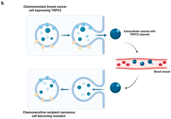 Moreover, TRPC5 has been identified as a potential exosome biomarker in breast cancer chemoresistance, affecting the neighboring cells. It has been shown that chemosensitive breast cancer cells can acquire a chemoresistant phenotype when exposed to extracellular vesicles (eVs) expressing TRPC5 [54] (Figure 2b). These eVs are constantly released by certain chemoresistant breast cancer cells and have the ability to convey their drug-resistant characteristics to adjacent cells. By transferring TRPC5, recipient cells were able to produce this Ca2+-permeable channel, which in turn stimulated the production of p-gp in recipient cells [54]. As a result, non-resistant cells were able to acquire chemoresistance.