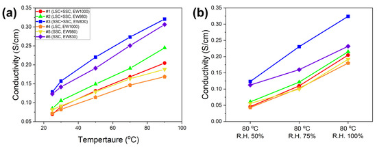 The ion conductivity of the blended #1 (circle, LSC + SSC, EW 1000), #2 (triangle, LSC + SSC, EW 980), and #3 (square, SSC + SSC, EW 830) ionomers and the single #4 (pentagon, LSC, EW 1000), #5 (inverted triangle, SSC, EW 980), and #6 (diamond, SSC, EW 830) ionomers as a function of (a) temperature at R.H. 100% and (b) R.H at 80 °C.