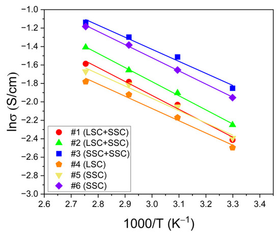 The activation energy of the ionomers representing the minimum energy required for proton conduction between ion cluster sites is shown in Figure 2. Low activation energy for proton conduction reduces energy loss due to the low ionic resistance of the ionomers and improves the PEMFC performance [40]. The activation energy of the ionomers is calculated based on the temperature-dependent ion conductivity using Arrhenius plots and is summarized in Table 2. The blended #3 (SSC + SSC, EW 830) shows the lowest activation energy value (10.86 kJ/mol), and the single #5 (SSC, EW 980) and #6 (SSC, EW 830) show values lower than 12 kJ/mol. The samples with low activation energy values were prepared using only the SSC-ionomer. The ionomers with SSC and low EW can help reduce the activation energy in proton conduction due to well-connected ion clusters and higher IEC compared to LSC-ionomers, respectively. Therefore, SSC-ionomers should be used for energy efficiency enhancements required for CL ionomer binders and membranes in PEMFCs [41].