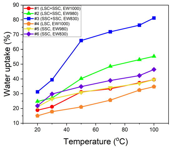 Water uptake is an important ionomer’s property mainly influenced by the EW of the ionomers. Low-EW ionomers have a higher number of sulfonic acid groups, which results in a higher water uptake. Finally, it causes the formation of better ion clustering to enhance proton conduction. On the other hand, high-EW ionomers show the opposite behavior, which is lower water uptake and poor ion clustering [42]. The water uptake of the blended and single ionomers as a function of temperature is shown in Figure 3. The water uptake of all prepared ionomers increases with temperature, and the blended #1, #2, and #3 ionomers show higher water uptake than the single #4, #5, and #6 ionomers. It is noted that the blended #2 (LSC + SSC, EW 980) ionomer shows higher water uptake over the entire temperature range than the single #5 (SSC, EW 980) ionomer. In particular, the blended #3 (SSC + SSC, EW 830) ionomer shows a rapid increase in water uptake as the temperature increases. Compared to the single #6 (SSC, EW 830), much higher water uptake is exhibited. Even though they have a similar EW, it implies that the blended ionomers have a bulk structure to form a competent free volume. The movement of protons within ionomers depends on either the vehicular mechanism, which involves the transfer of hydrated protons and/or the Grotthuss mechanism, which entails the rearrangement and “hopping” of protons within extensive hydration structures [16,43]. The presence of well-formed ion cluster channels through the blended ionomers is attributed to improved water retention in the free volume of the ionomers. It is noteworthy for the PEMFC application as a membrane and/or CL binder in low external R.H. conditions due to their excellent water absorption.
