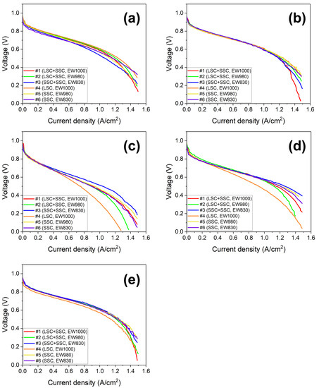 The I–V polarization of the MEAs based on the blended #1 (red, LSC + SSC, EW 1000), #2 (green, LSC + SSC, EW 980), and #3 (blue, SSC + SSC, EW 830) and the single #4 (orange, LSC, EW 1000), #5 (yellow, SSC, EW 980), and #6 (purple, SSC, EW 830) at the operation conditions: (a) 70 °C with R.H. 100%, (b) 75 °C with R.H. 100%, (c) 80 °C with R.H. 50%, (d) 80 °C with R.H. 75%, (e) 80 °C with R.H. 100% in a potentiostatic mode.