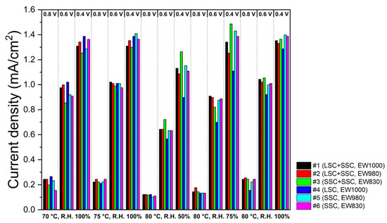 Current density from I-V polarization curves of the blended and the single ionomer-based MEAs measured at 70 °C with R.H. 100%, 75 °C with R.H. 100%, 80 °C with R.H. 50%, 80 °C with R.H. 75%, and 80 °C with R.H. 100%.