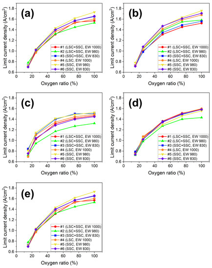 The oxygen ratio-dependent limiting current density of the blended and the single ionomer-based MEAs at (a) 70 °C with R.H. 100%, (b) 75 °C with R.H. 100%, (c) 80 °C with R.H. 50%, (d) 80 °C with R.H. 75%, (e) 80 °C with R.H. 100% for the blended #1 (circle, LSC + SSC, EW 1000), #2 (triangle, LSC + SSC, EW 980), and #3 (square, SSC + SSC, EW 830) ionomer and the single #4 (pentagon, LSC, EW 1000), #5 (inverted triangle, SSC, EW 980), and #6 (diamond, SSC, EW 830) ionomer.