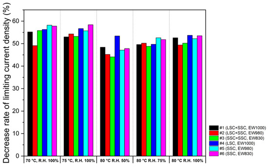 The decreasing rates of limiting current density of the blended and the single ionomer-based MEAs at 70 °C with R.H. 100%, 75 °C with R.H. 100%, 80 °C with R.H. 50%, 80 °C with R.H. 75%, and 80 °C with R.H. 100%.