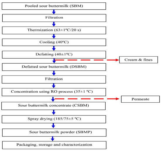 A single-stage spray drier (Jektron Pvt. Ltd., Pune, India) equipped with rotary atomizer was used for the spray drying (185/75 ± 5 °C of RO concentrate to obtain SBMP powder. This non-agglomerated SBMP was immediately packed and sealed in metalized polyester-LDPE laminates, which were stored at 4 ± 1 °C till further analysis. Sour buttermilk powder (SBMP) was prepared (Figure 1) and analyzed in triplicate