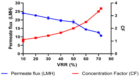 The change in permeate flux was recorded and expressed as a function of percent VRR and concentration factor (CF), as shown in Figure 2. The flux mean (FM) was calculated from initial flux (IF) and final flux (FF) values using following formula earlier described by St-Gelais et al. [18].