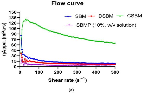 Defatting significantly (p < 0.05) decreased the TS, as well as the ƞAppa, of DSBM as compared to SBM. This could have been attributed to the removal of milk fat and suspended milk solids. Opposite to this, the concentration of DSBM in RO significantly (p < 0.05) increased the TS and ƞAppa of CSBM. The ƞAppa of SBM, DSBM and CSBM exhibited a gradual decrease with the increasing shear rate and temperature, as demonstrated in Figure 3a,b, respectively.