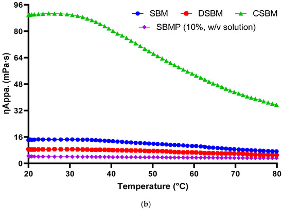 The apparent viscosity of reconstituted SBMP solution was measured and is shown in Table 2. In the case of yoghurt powder, the consistency of reconstituted yoghurt solution was thinner than that of original yoghurt [84]. This may be due to extensive heat treatment during spray drying which results in the denaturation of milk protein. This showed poor rheological attributes during rehydration [85]. Hence, similar changes could also explain the three-times-lower apparent viscosity of SBMP (Table 2) compared to SBM (Table 1).