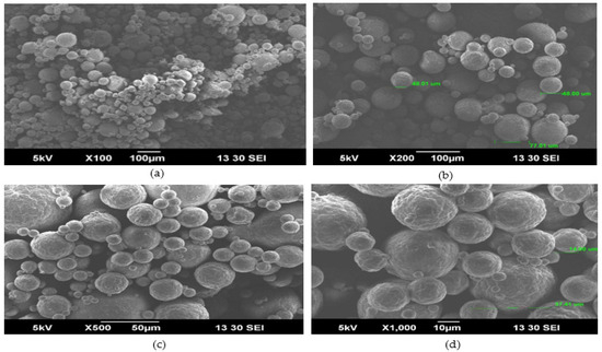 Table 2 clearly represents the particle size distribution of SBMP. A higher number of particles (d10, d50 and d90) with a lower specific surface area (SSA) and span were observed for SBMP. The d10 of SBMP (Table 2) was higher than that of (27.15 µm) SMP but lower than that of (86.10 µm) WMP [59]. Furthermore, its d50 was lower than that of both SMP (83.87 µm) and WMP (128.76 µm), as reported by Pugliese et al. [59]. Similar findings were also observed for its d90, as shown in Table 2. The d90 values of SMP and WMP were 191.55 µm and 287.40 µm, respectively [59]. The D4,3 value of SBMP (Table 2) was found to be lower than that of SMP (9.56 µm) and WMP (49.17 µm), whereas the D3,2 value was higher than that of SMP (151.33 µm) but found to be lower than that of WMP (86.10 µm) [59], as reported in Table 2. The observed variation in the particle size distribution of SBMP could be attributed to the low total solids and viscosity of feed. The SEM micrograph (Figure 5) of the manufactured SBMP also indicates a porous structure and variability in their particle size, with a significant number of smaller-sized particles.