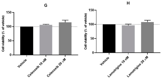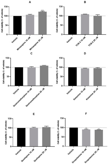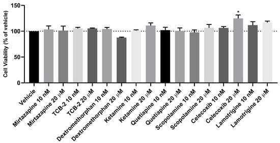 Effect of 48 h incubation of 10 nM and 20 μM of Mirtazapine, TCB-2, Dextromethorphan, Ketamine, Quetiapine, Scopolamine, Celecoxib, and Lamotrigine on the viability of SH-SY5Y cells, under normoxia conditions, determined by MTT assay, 48 h. The results represent the mean ± SEM of three independent experiments, expressed as the percentage of the vehicle (100%). Statistically significant * p < 0.05.