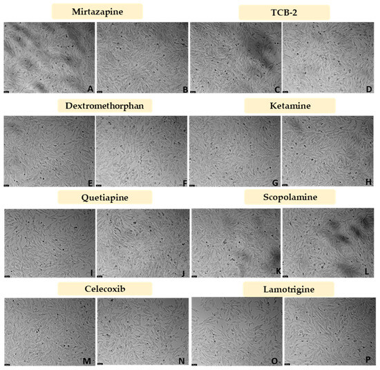 Representative images (100 × total magnification) of SH-SY5Y cells under hypoxia conditions. Cells were treated with (A) Mirtazapine 10 nM, (B) Mirtazapine 20 µM, (C) TCB-2 10 nM, (D) TCB-2 20 µM, (E) Dextromethorphan 10 nM, (F) Dextromethorphan 20 µM, (G) Ketamine 10 nM, (H) Ketamine 20 µM, (I) Quetiapine 10 nM (J) Quetiapine 20 µM, (K) Scopolamine 10 nM, (L) Scopolamine 20 µM, (M) Celecoxib 10 nM, (N) Celecoxib 20 µM, (O) Lamotrigine 10 nM, and (P) Lamotrigine 20 µM. The vehicle is represented in Figure 2A.