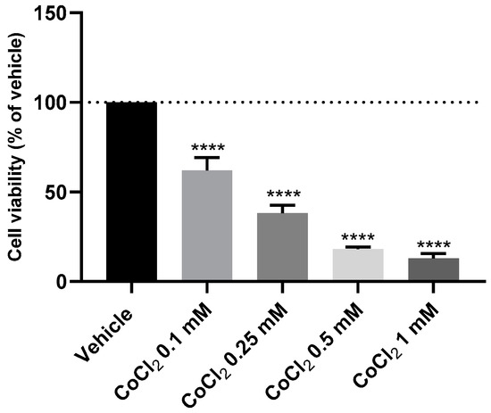 Effect of 48 h incubation of 0.1–1 mM of CoCl2, determined by MTT assay. The results represent the mean ± SEM of three independent experiments, expressed as the percentage of the vehicle (100%). Statistically significant **** p < 0.0001 vs. vehicle.