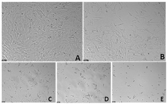 Representative images (100 × total magnification) of SH-SY5Y cells after 48 h exposure to (A) 1% sterilized water (vehicle), (B) CoCl2 0.1 mM, (C) CoCl2 0.25 mM, (D) CoCl2 0.5 mM, and (E) CoCl2 1 mM.