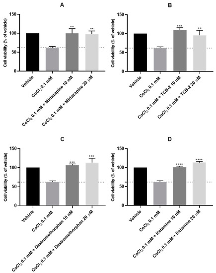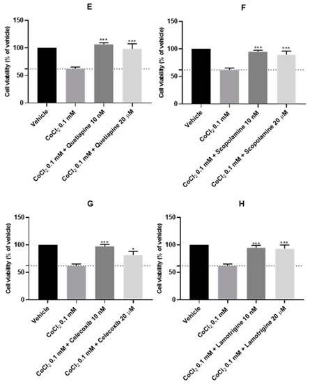 Effect of 48 h incubation of CoCl2 0.1 mM in combination with 10 nM and 20 μM of (A) Mirtazapine, (B) TCB-2, (C) Dextromethorphan, (D) Ketamine, (E) Quetiapine, (F) Scopolamine, (G) Celecoxib, and (H) Lamotrigine on the viability of SH-SY5Y cells, determined by MTT assay. The results represent the mean ± SEM of three independent experiments, expressed as the percentage of the vehicle (100%). Statistically significant * p < 0.05, ** p < 0.01, *** p < 0.001, and **** p < 0.0001 vs. vehicle.