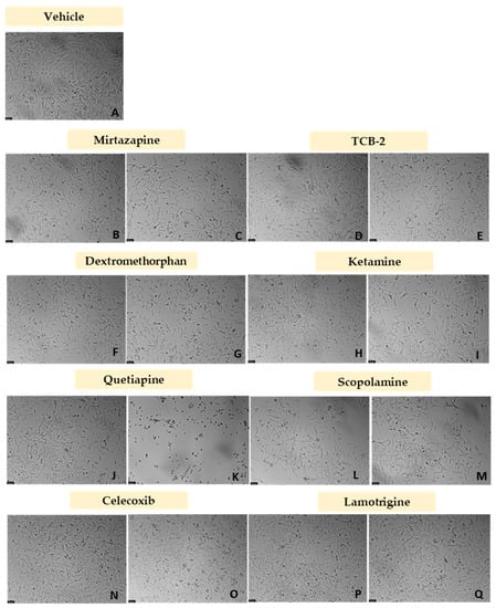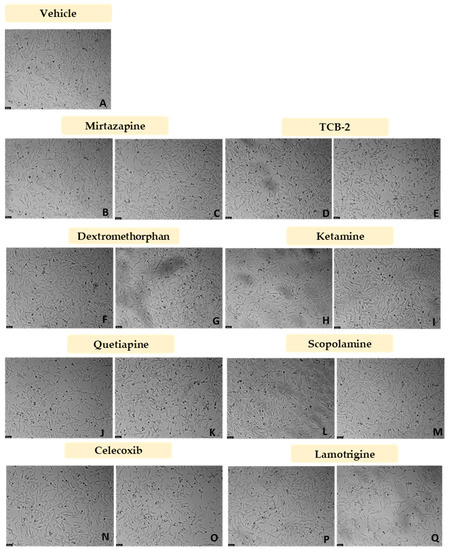 Representative images (100 × total magnification) of SH-SY5Y cells treated with (A) 0.2%DMSO/2% sterilized water (vehicle), (B) CoCl2 0.1 mM + Mirtazapine 10 nM, (C) CoCl2 0.1 mM + Mirtazapine 20 µM, (D) CoCl2 0.1 mM + TCB-2 10 nM, (E) CoCl2 0.1 mM + TCB-2 20 µM, (F) CoCl2 0.1 mM + Dextromethorphan 10 nM, (G) CoCl2 0.1 mM + Dextromethorphan 20 µM, (H) CoCl2 0.1 mM + Ketamine 10 nM (I) CoCl2 0.1 mM + Ketamine 20 µM, (J) CoCl2 0.1 mM + Quetiapine 10 nM, (K) CoCl2 0.1 mM + Quetiapine 20 µM, (L) CoCl2 0.1 mM + Scopolamine 10 nM, (M) CoCl2 0.1 mM + Scopolamine 20 µM, (N) CoCl2 0.1 mM + Celecoxib 10 nM, (O) CoCl2 0.1 mM + Celecoxib 20 µM, (P) CoCl2 0.1 mM + Lamotrigine 10 nM, and (Q) CoCl2 0.1 mM + Lamotrigine 20 µM.
