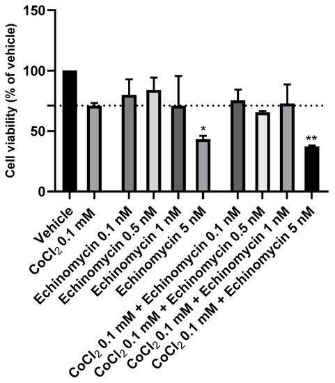 Effect of 48 h incubation of CoCl2 0.1 mM, Echinomycin 0.1 nM-5 nM, and the combination of CoCl2 0.1 mM with Echinomycin 0.1 nM–5 nM on the viability of SH-SY5Y cells, determined by MTT assay. The results represent the mean ± SEM of three independent experiments, expressed as the percentage of the vehicle (100%). Statistically significant * p < 0.05 and ** p < 0.01 vs. vehicle.