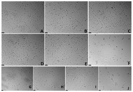 Representative images (100 × total magnification) of SH-SY5Y cells treated with (A) 0.2%DMSO/2% sterilized water (vehicle), (B) CoCl2 0.1 mM, (C) Echinomycin 0.1 nM, (D) Echinomycin 0.5 nM, (E) Echinomycin 1 nM, (F) Echinomycin 5 nM, (G) CoCl2 0.1 mM + Echinomycin 0.1 nM, (H) CoCl2 0.1 mM + Echinomycin 0.5 nM (I) CoCl2 0.1 mM + Echinomycin 1 nM, and (J) CoCl2 0.1 mM + Echinomycin 5 nM.
