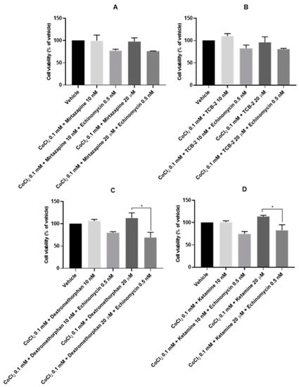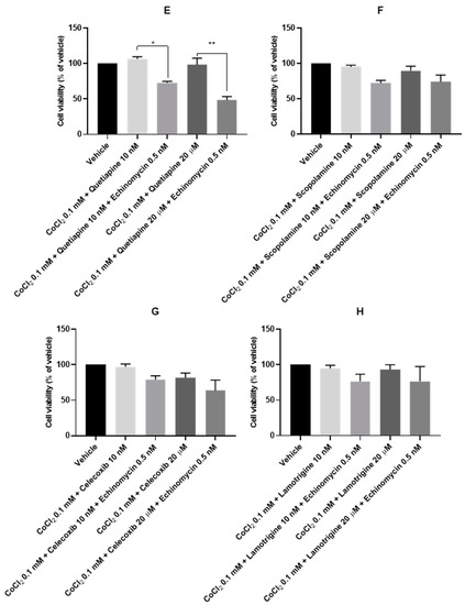 Effect of 48 h incubation of the combination of CoCl2 0.1 mM, Echinomycin 0.5 nM and 10 nM/20 μM of (A) Mirtazapine, (B) TCB-2, (C) Dextromethorphan, (D) Ketamine, (E) Quetiapine, (F) Scopolamine, (G) Celecoxib, and (H) Lamotrigine on the viability of SH-SY5Y cells, determined by MTT assay. The results represent the mean ± SEM of three independent experiments, expressed as the percentage of the vehicle (100%). Statistically significant * p < 0.05 and ** p < 0.01.