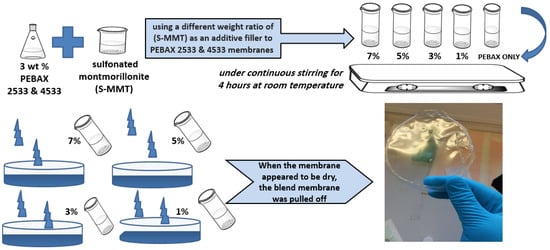 All membranes were prepared using the casting-solution method. PEBAX 2533 was dissolved in ethanol/water (9:1) and dissolved under reflux for 2 h at 80 °C. PEBAX 4533 was dissolved in a mixture of 1-propanol and 1-butanol (3/1 (v/v)) under reflux for 3 h at 60 °C. When the polymers were totally dissolved, different amounts of S-MMT were added to the solutions under continuous stirring for 4 h at room temperature. Casting solutions (3 wt% to polymers) were poured onto glass Petri dishes and left to dry for 48 h [21]. Figure 1 illustrates the fabrication procedure of membranes.