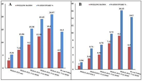 Water uptake and swelling ratio for PEBAX 2533 and for PEBAX 4533 (A,B) at different S-MMT content.