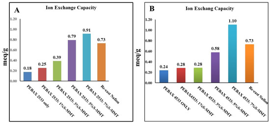 Ion exchange capacity of PEBAX 2533 and PEBAX 4533 (A,B) with different S-MMT contents.