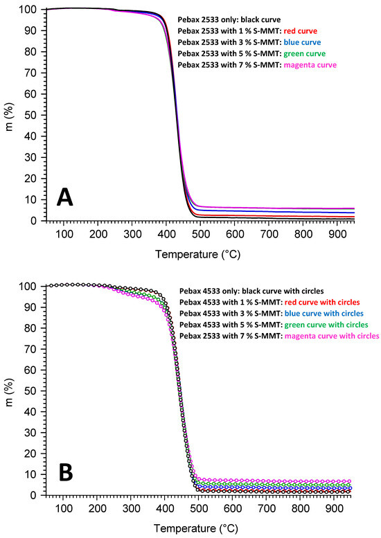 The thermal stability of PEBAX 2533 and PEBAX 4533 (A,B) with different S-MMT content.