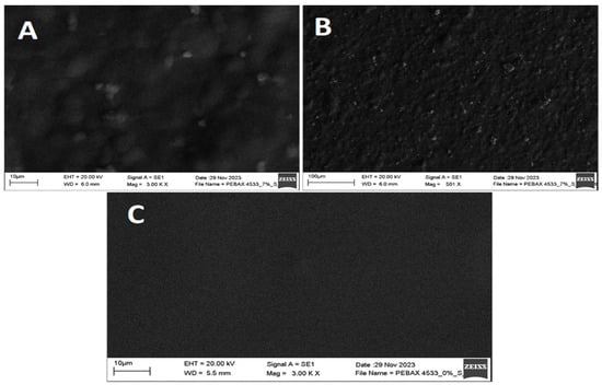 SEM images of PEBAX 2533 with 7% S-MMT filler (A,B) and without S-MMT filler (C).