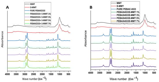 FTIR spectra of PEBAX 2533 and PEBAX 4533 (A,B) with different S-MMT content.