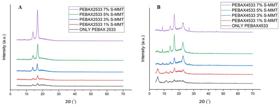The X-ray diffraction (XRD) patterns of the membranes are shown in Figure 8A,B. The semicrystalline character of PEBAX-type copolymers is attributed to the presence of both amorphous PTMO and crystalline PA12 segments [21]. The observed five peaks at 2θ = 5.7°, 11.1°, 14.2°, 17.9°, and 22.3° are in agreement with the peak positions assigned to the PA12 component of the parent PEBAX 4533 polymer. In the case of pure PEBAX 2533, two distinct peaks obtained at 13.7° and 18.1° are also attributed to PA12 [13]. The observed deviance in the peak intensities between two pristine PEBAXs can be attributed to the difference in the relative ratio of rigid and flexible segments. According to the spectra shown in Figure 8A,B, with the addition of nanofiller to the PEBAX 2533 matrix, the intensity of the peaks at 13.7° and 18.1° gradually increased with the increase in the amount of S-MMT. This rise in intensity suggests an enhancement in membrane crystallinity. As a nucleating agent, S-MMT can promote formation and growth of nuclei of polymer segments. For the PEBAX4533 series, the two peaks (at 5.7° and 11.1°) seen in the parent and 1%-S-MMT-loaded PEBAX4533 were absent in the XRD patterns of blends with 3%, 5%, and 7% nanofiller content. Simultaneously, with the increase in filler content, new peaks appeared at 9.5° and 27.4°, with a gradual increase in intensity. The strong compatibility between S-MMT and PEBAX 2533, as well as PEBAX 4533 matrices, improved the crystallization process of PEBAX.