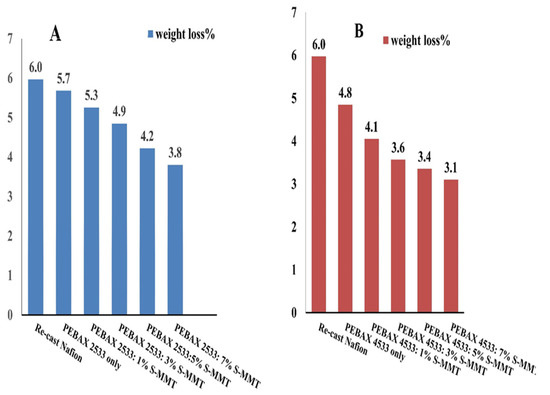 Chemical stability based on Fenton’s test of PEBAX 2533- and PEBAX 4533-based blended membranes (A,B) with different S-MMT content.