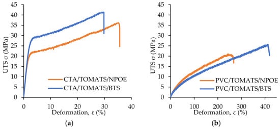 Ultimate tensile strength (UTS) for PIMs made of (a) CTA and (b) PVC and the corresponding plasticizer.