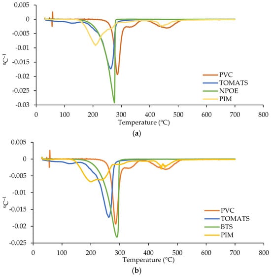 Similar results were found for the PVC membranes, as shown in Figure 5a for NPOE and Figure 5b for BTS. In this case, it was not possible to distinguish between the degradation of the polymer and the other components of the membrane, since the degradation temperature of the pure PVC was close to those of both the TOMATS and plasticizer.
