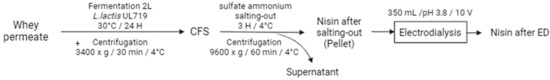 Nisin purification from the CFS was tested using ED process, as shown in Figure 1. Nisin was produced in 2 L of whey permeate medium and the salting out procedure was carried out at the previous optimal ammonium sulfate salt concentration saturation level. The solution was then centrifuged at 9600× g for 60 min at 4 °C. The pellet was then solubilized in 30 mL of distilled water and freeze-dried. This solution was identified as ‘’nisin after salting-out” (Figure 1).