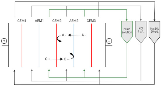 Recently, the purification of nisin from a commercial solution was studied using conventional electrodialysis (ED) [33]. Conventional ED, an electrochemical method using electrodes and ion exchange membranes (IEM), allows for the purification and demineralization of charged molecules under the application of an electric potential gradient [34]. ED is a cost-effective process, commonly used for desalination of water and wastewater, since it has a low energy consumption compared with thermal processes (evaporation/distillation) and reverse osmosis [35,36]. Moreover, the main application of ED in the food industry is demineralization of whey [37,38]. In a previous study from Rulence et al. [33], the effectiveness of ED for the demineralization and purification of nisin in comparison with a multiple-step centrifugation process that had already been used was demonstrated; a purification factor of 1.19, fold concentration of 10.39 and protein recovery yield of 83.8% were achieved. The demineralization and purification by ED of high salt content products thus represent an interesting way to purify nisin without the production of polluting saline effluents. However, to the best of our knowledge, there are no studies reporting on the implementation and the use of electromembrane technology for nisin purification from a food by-product cell-free supernatant.