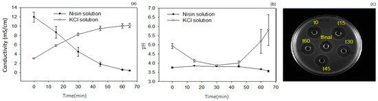 Evolution of (a) nisin and KCl solution conductivity, (b) pH of nisin and KCl solution and (c) antimicrobial activity of the nisin solution during demineralization process. (●) nisin solution and (○) KCl solution.