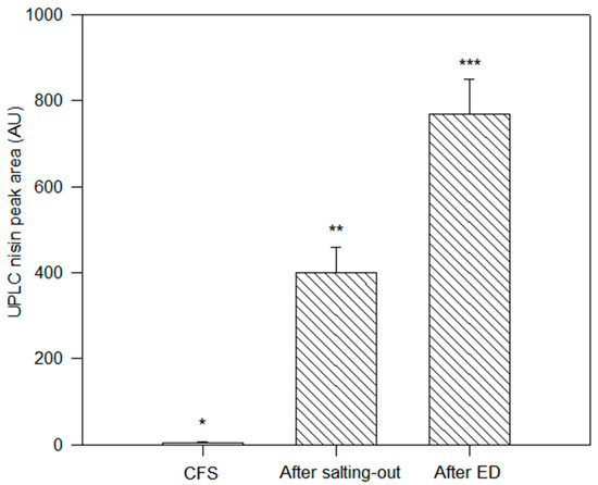 UPLC peak area of nisin in the initial CFS, after salting out and after ED purification. Nisin peak was confirmed by MS according to its 3500 Da molecular weight. Columns with a different number of asterisks (*) are significantly different at p < 0.05 (t-test).