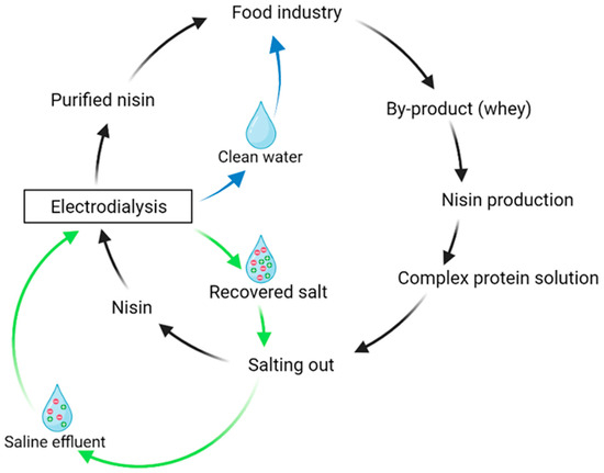 These results are, moreover, highlighted by the advantages of ED. Indeed, ED is a more eco-friendly technique, using no chemical solvents and having a lower energy consumption compared with other methods employed for purification or desalinization [36,59]. Its capacity to process saline effluents could also be of interest. As illustrated in Figure 5, a circular economy scheme could be implemented initially from the production of nisin, using by-products generated by the food industry such as whey. The use of whey or other by-products would allow for the recycling of effluents produced in the food industry into fermentation broths and to the reduction of nisin production costs, one of the main current hurdles for its production. In addition, the circular economy concept would be reflected by (1) the use of ED in the purification of nisin from a food by-product to produce a purified nisin with further applications as a food preservative within the same food industry and (2) considering ED’s capacity to treat saline effluents produced during the salting out step. Among the different methods used for saline effluent treatment such as thermal methods, biological methods or membrane-based methods, ED could allow for the recycling of salts by reusing the concentrated salt solution for the salt precipitation step in the nisin production scheme. The implementation of ED in a circular economy, from nisin production to the treatments and recovery of salts from saline effluents, is a novel perspective, proposed for the first time here. Indeed, the use of ED for the treatment of high-salt effluent and wastewater was already reported by Bazinet et al. (2020) and Chen et al. (2020) [59,60], but investigations in order to implement saline effluent treatment with ED in this scheme could be of interest. Further investigations regarding production costs and life cycle assessments for the eco-circular scheme would be necessary to confirm its viability.