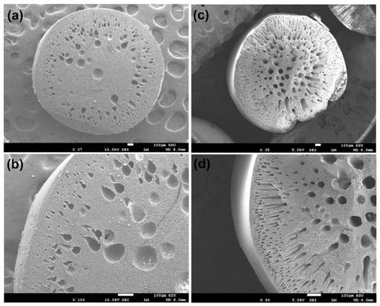 Cross-section morphology depicting: (a,b) polymeric beads and (c,d) nanocomposite beads, showcasing the internal structure and characteristics of both materials at different magnifications.