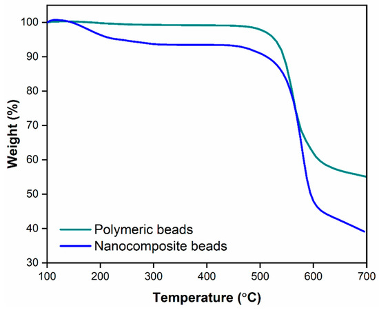 Thermogravimetric analysis illustrating the comparative thermal properties of polymeric beads and nanocomposite beads, showcasing their respective thermal stability and decomposition profiles.